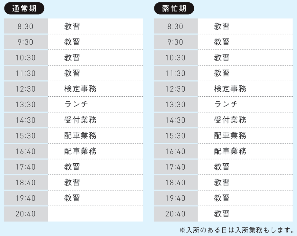 - 私は教習に加えて事務を兼務しているので、受付、入所業務、配車予約(スケジュール作成)などの業務も一通り担当しています。基本的な業務はいつも変わりませんが、教習生の多い繁忙期には、いつもより多めに教習をするようになります。
